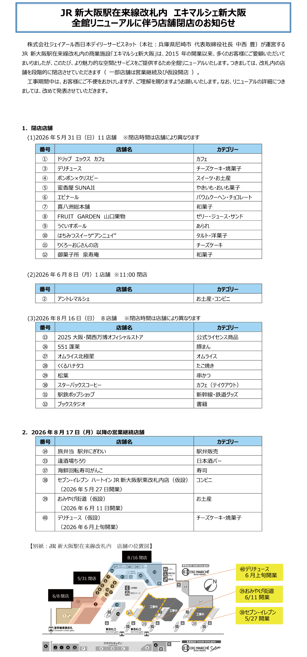 エキマルシェ新大阪 全館リニューアルに伴う店舗閉店のお知らせ